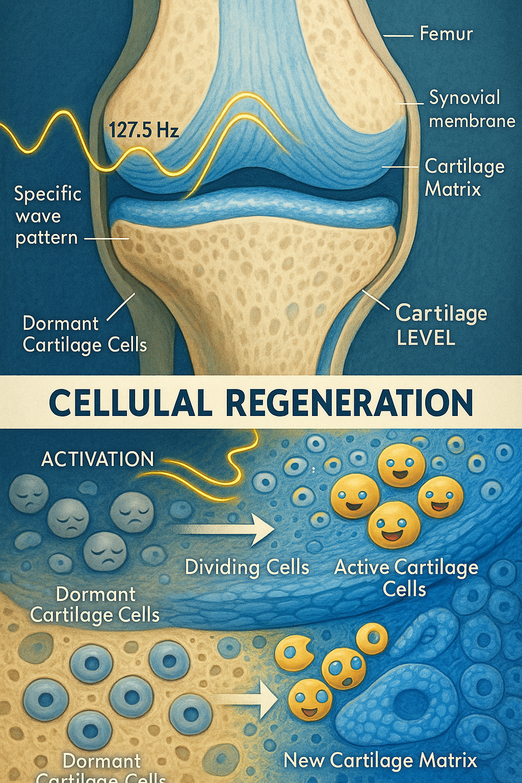Harvard scientists discovered that healthy cartilage cells vibrate at exactly 127.5 Hz. Like a tuning fork responding to its perfect pitch, dormant cells wake up when they hear this frequency.